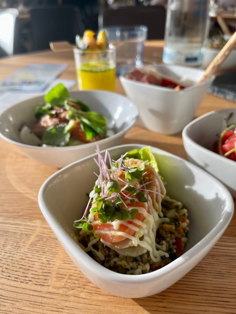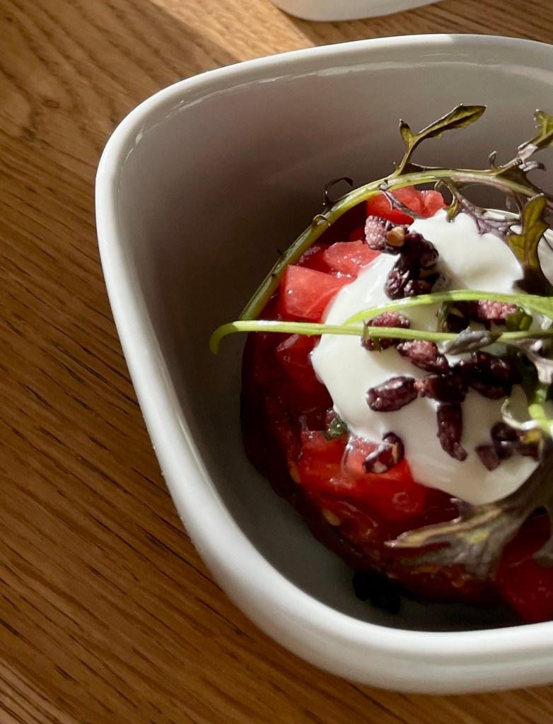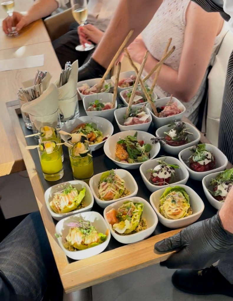 Die Vorspeisen wurden in vielen kleinen Schälchen serviert. Unser Liebling war der Orangenlachs mit eingelegtem Couscous & Romanasalat. Die Wassermelone zum Beef Tatar vom Ox Minze & luftigem Sauerrahm war richtig erfrischend. Ein toller Farb- und Genusstupfer die Gazpacho von der gelben Tomate mit gegrillter Jakobsmuschel & Zucchini.