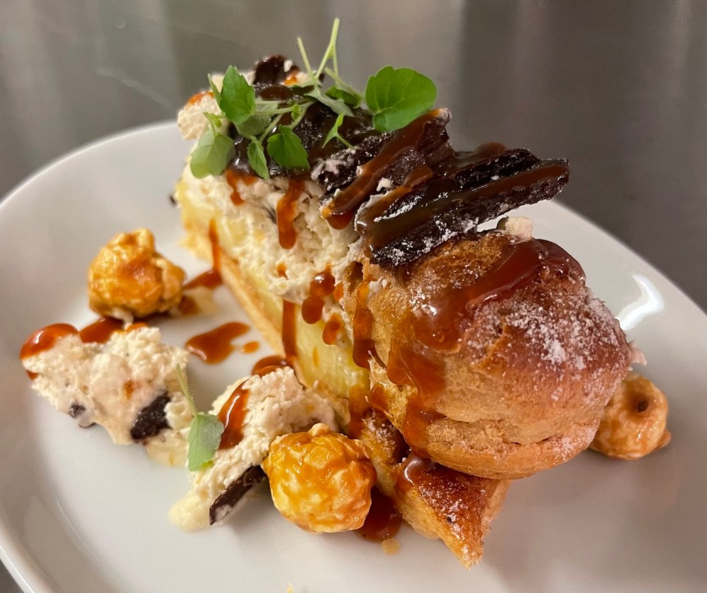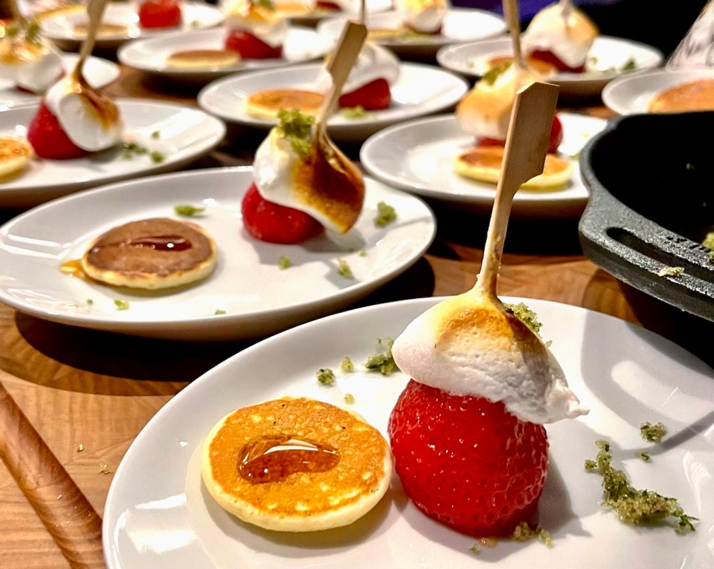 Die weiteren Nachspeisen konnte man sich wieder in der offenen Küche abholen. Angerichtet wurde vom Küchenteam „Toscanella“ Orangen-Blätterteig mit Karamell Popcorn, Cocos-Crème-Brûlée mit Ananas-Papaya-Spieß und JOHANNS-Interpretation von Schwarzwälder Kirsch.