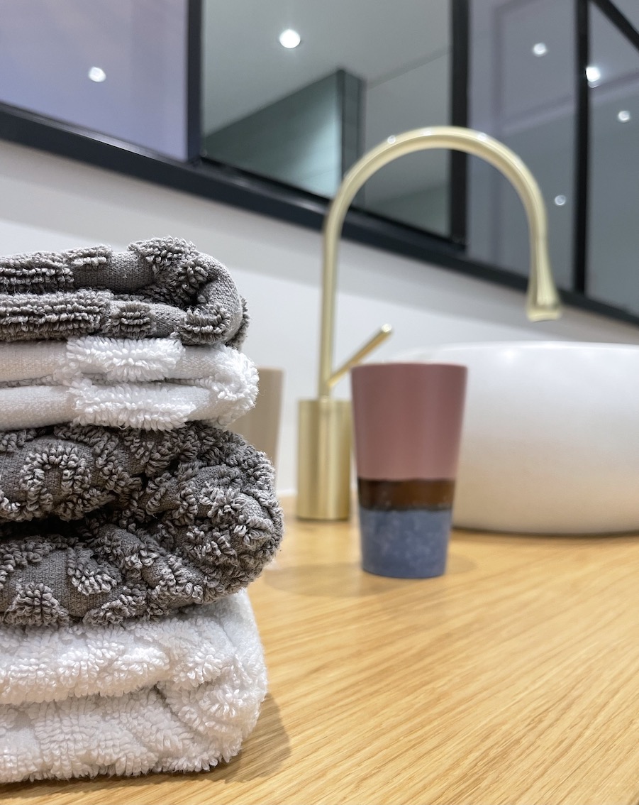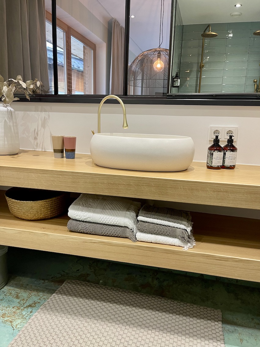 Hingucker sind hier die goldenen Armaturen, die dicken Handtücher und die Doppeldusche.