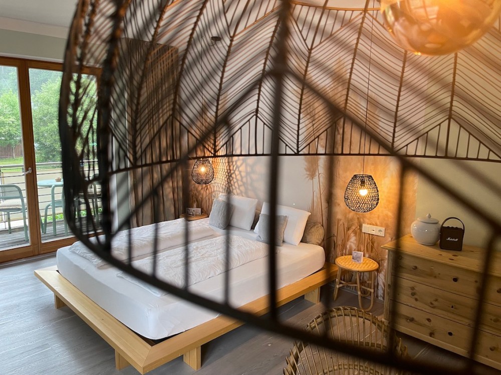 Großzügiges Doppelzimmer mit großen Panoramafenstern und einem umlaufenden Balkon mit vielen chilligen Plätzen.
