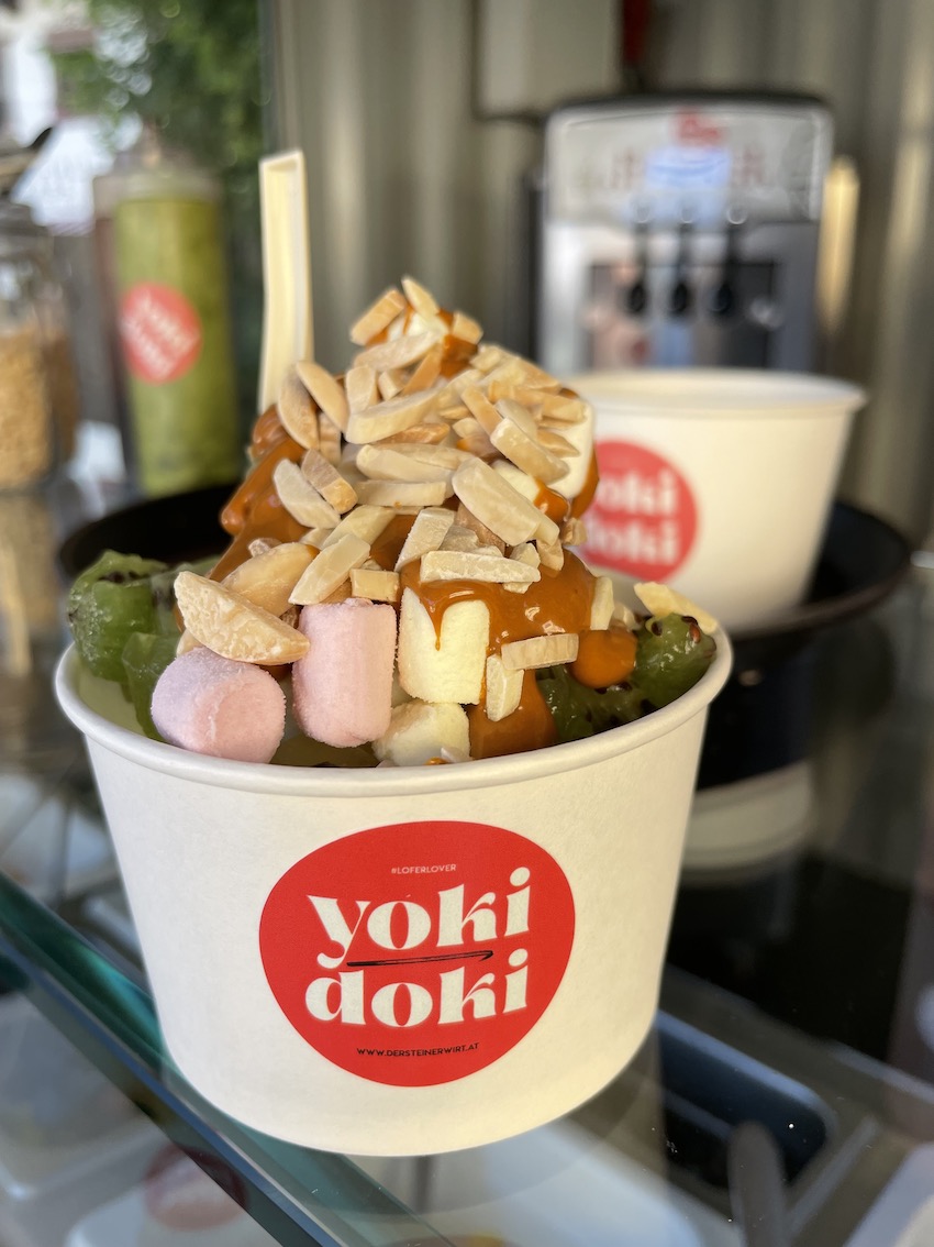 Gönnt euch den selbstgemachten frozen joghurt mit leckeren Toppings aus dem Container neben der Terrasse.