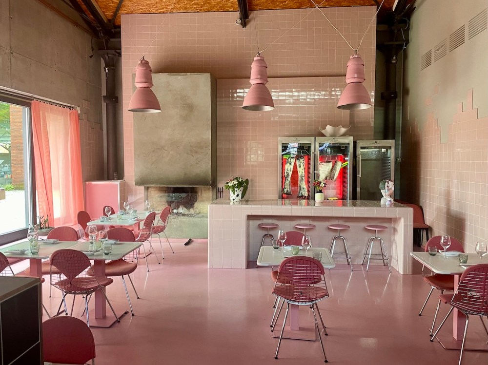 Ganz neu gestaltet wurde das Kaminzimmer. Das zwei Stufen tiefer liegende Separee ist durch einen Kettenvorhang vom Gastraum getrennt und in Anspielung an eine Metzgerei komplett in Rosa gestaltet. Was für ein Hingucker. Ebenso wie die überdimensionale, blinkende Kuckucksuhr.