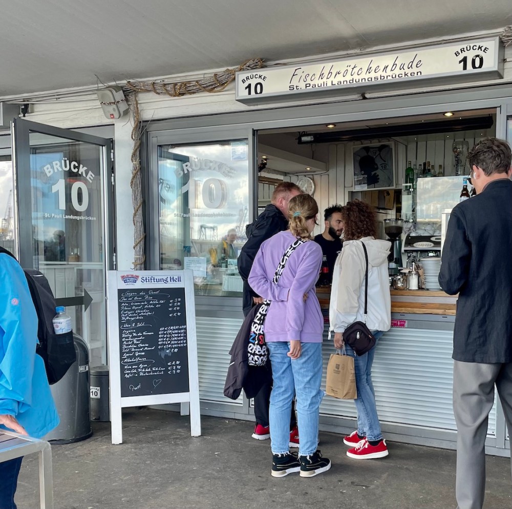 Die kultigste Fischbrötchenbude Hamburgs, denn in jedem Reiseführer steht: „Die besten Fischbrötchen Hamburgs findet man am hinteren Ende der Landungsbrücken bei Brücke 10″