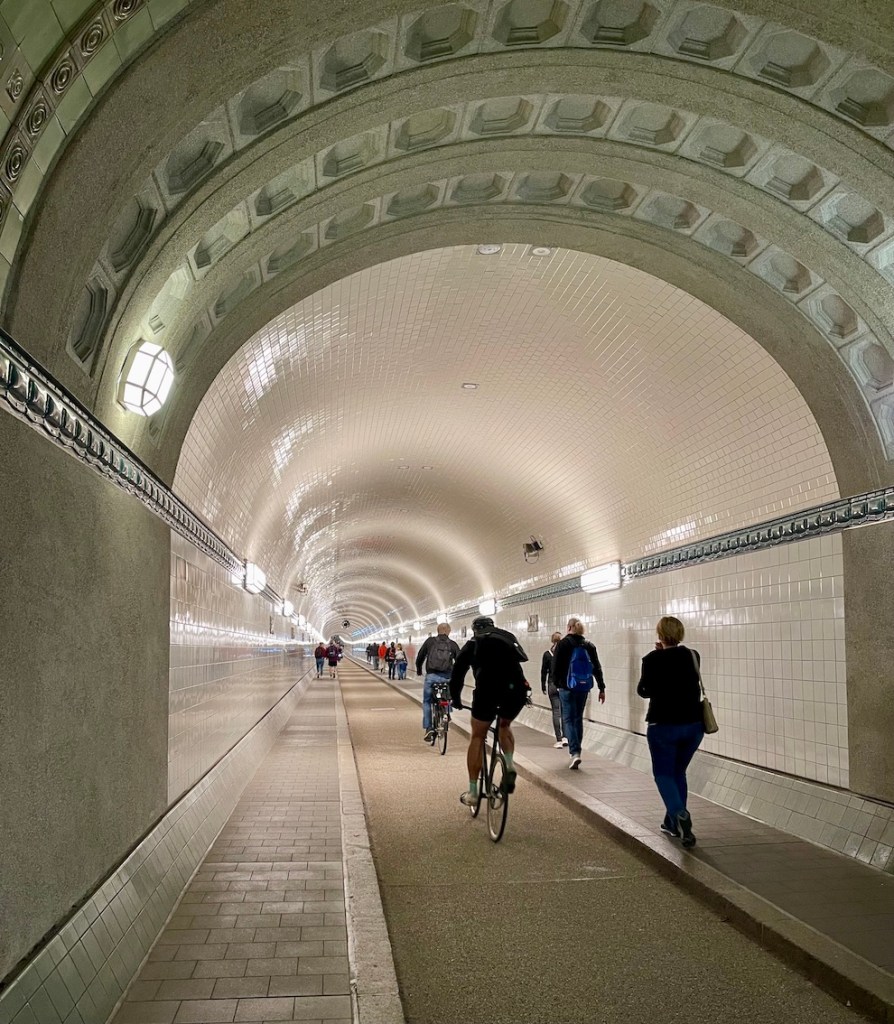 24 Meter unter der Elbe – echt unglaublich. Der Personenaufzug ist täglich rund um die Uhr offen.