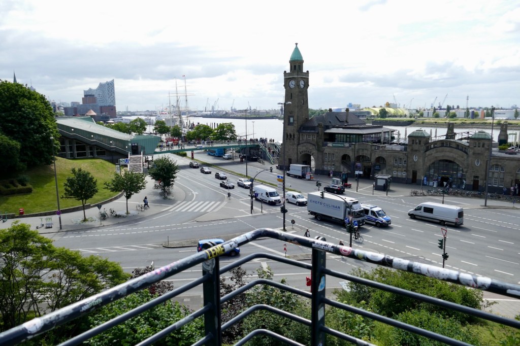 Durch den Elbrunnel durch zum Aussichtpunkt Steinwerder. Hier gibt es auch eine Bude vom Imbiss Brücke 10 – beste Fischbrötchen und Blick auf die Landungsbrücken von der anderen Seite auf Hamburg.