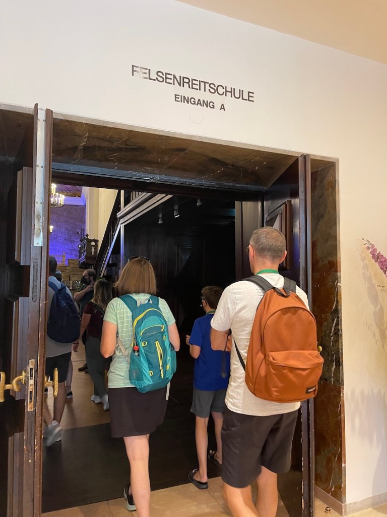 Ein weiterer Teil der Festspielhäuser heißt Felsenreitschule, weil dort im 17. Jahrhundert ein Reitplatz war. Beeindruckend ist auch das riesige Deckengemälde im Vorraum. Die seitlich gemalten Säulen stellen sich optisch auf je näher man ihnen kommt. Probiert es aus – echt fazinierend.