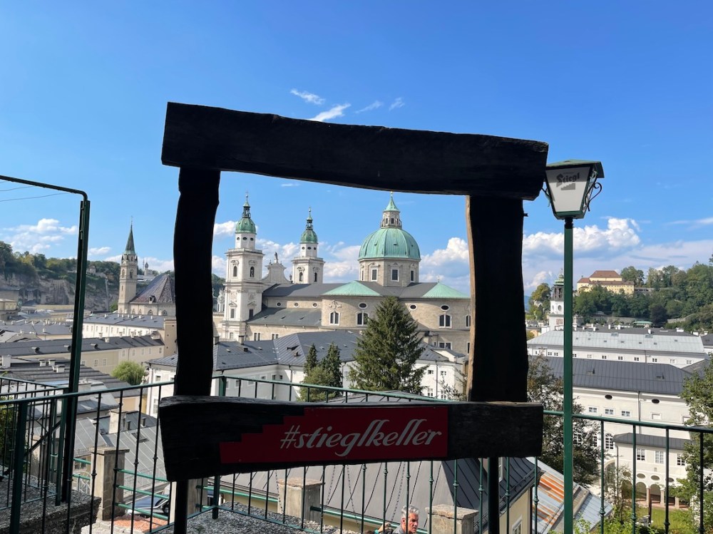 Wir haben uns für den Blick möglichst weit oben Richtung Festung Hohensalzburg entschieden. Diesen Blick könnt ihr auch ganz oben vom Restaurant aus genießen.