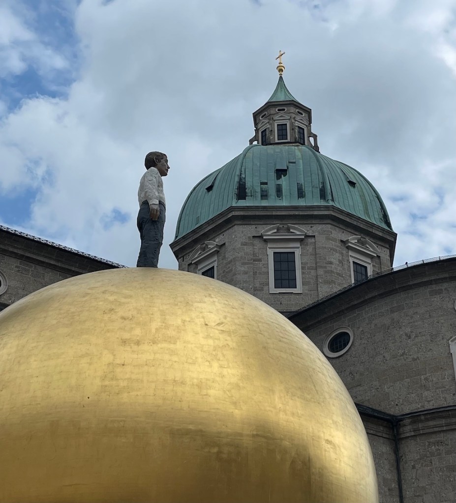 Auf dem Salzburger Kapitelplatz seht ihr schon von weitem die große goldene Kugel, auf der ein Mann steht, der Jedermann sein könnte. Das ist die Spähre – ein Kunstwerk von Stephan Balkenhol. Die Goldene Kugel wird wohl umgangssprachlich auch Balkenhol-Mozartkugel genannt.