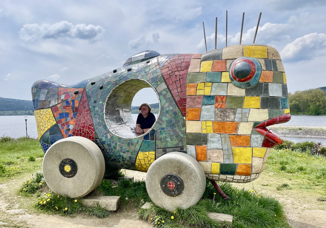 Über einen Fußgängertunnel beim Supermarkt gelangt ihr zum See. Flaniert entlang der Seepromenade zur Marina, leiht euch ein Elektro-Boot für eine Tour über den Stausee aus oder macht ein Erinnerungsfoto bei der großen Kunst-Skulptur, dem rollenden Fisch.