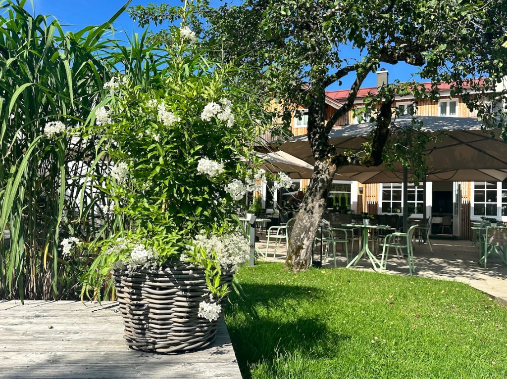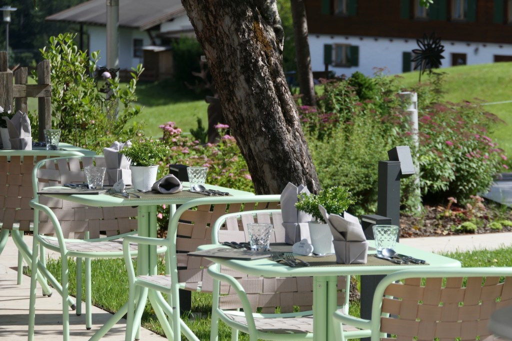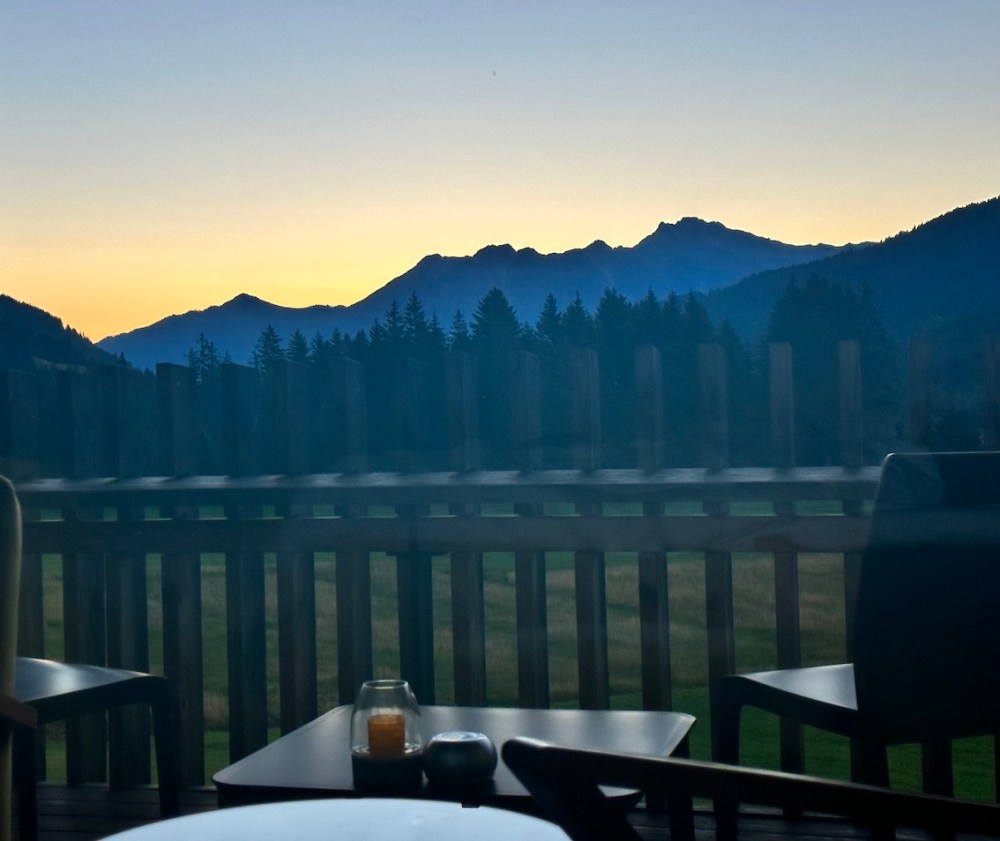 Ihr habt die Wahl, entweder draußen auf der herrlichen Terrasse mit bestem Bergblick oder lieber drinnen genießen.