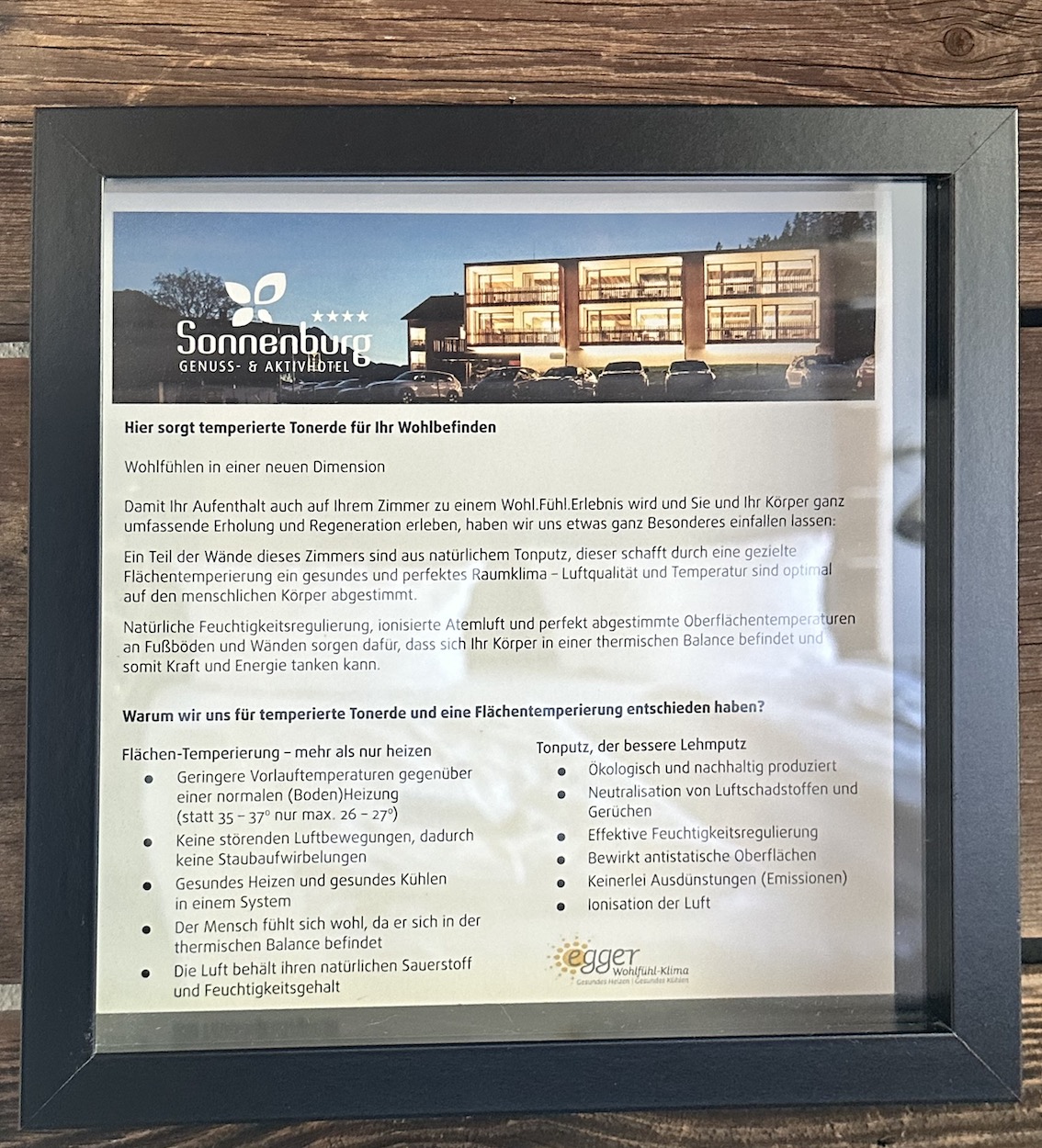 Temperierte Tonerde sorgt für euer Wohlbefinden. Ein Teil der Wände dieses Zimmers sind aus natürlichem Tonputz, dieser schafft durch eine gezielte Flächentemperierung ein gesundes und perfektes Raumklima – Luftqualität und Temperatur sind optimal auf den menschlichen Körper abgestimmt. Damit der Aufenthalt zum Wohl.Fühl.Erlebnis. wird.