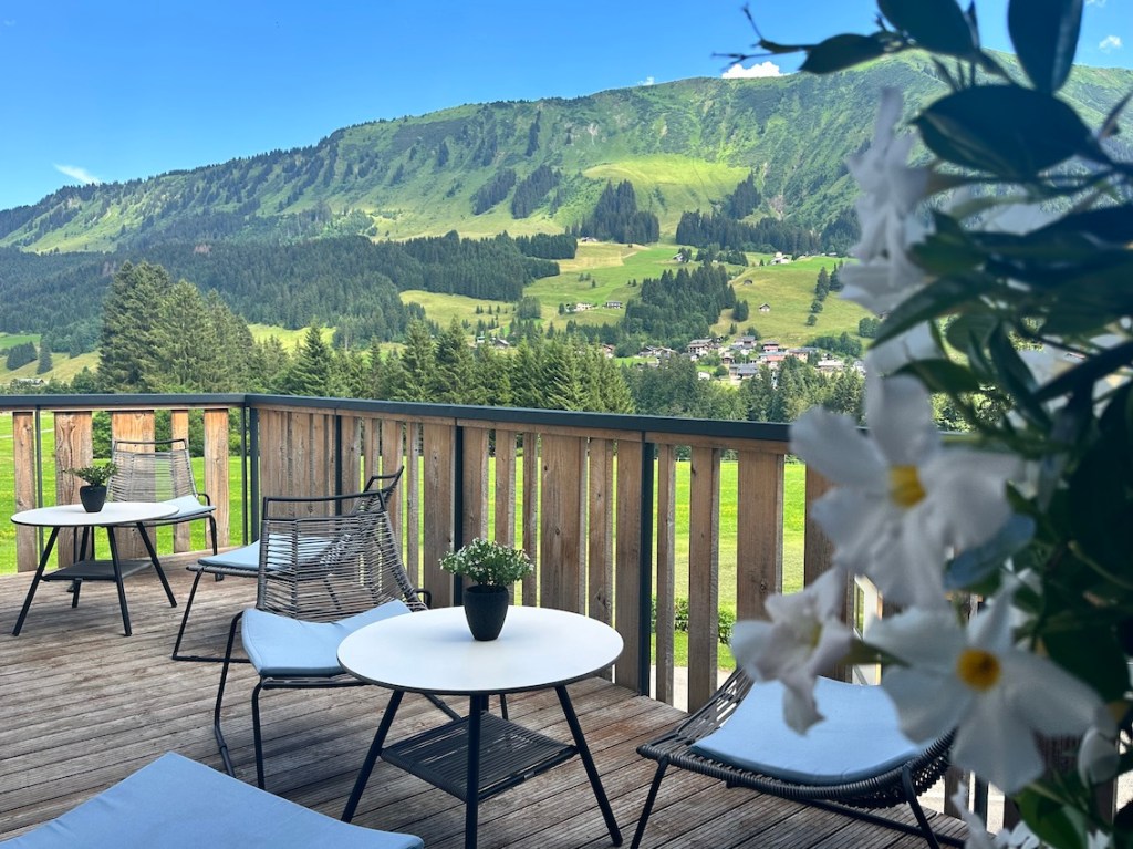 Direkt darunter könnt ihr auf dieser herrlichen Sonnenterrasse so richtig chillen und den unglaublichen Bergblick genießen.