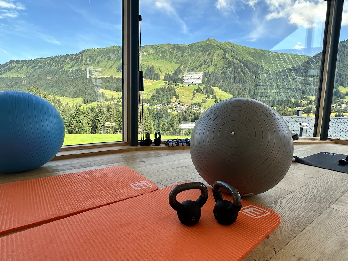 Der helle Raum mit 180° Bergpanorama wird ganz multifunktional genutzt: für Pilates- und Yogastunden, Personal Trainings, als Seminarraum für Meetings oder auch für private Feiern.