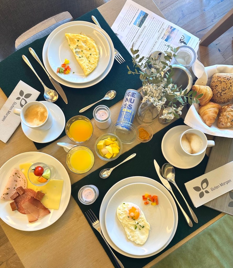 Die Eierspeisen, wie Spiegelei oder Kräuteromelette werden schon am Vortag von euch ausgewählt und dann frisch zubereitet an den Tisch gebracht, sobald ihr beim Frühstück seid.