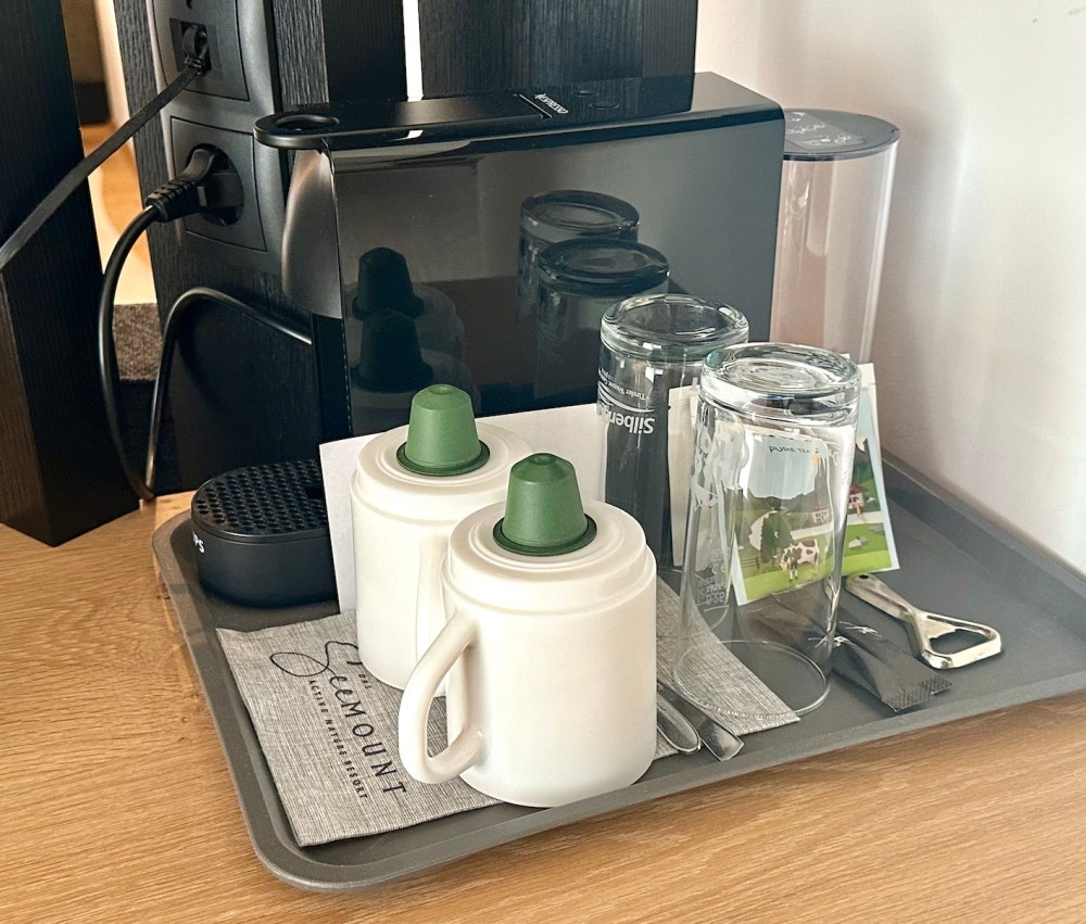 Im Zimmer befindet sich zudem eine gefüllte Minibar und eine Kapselmaschine für Espresso oder zum Zubereiten von Tee. Bei den Kaffeekapseln für 3,70 Euro das Stück geht das SeeMount einen ganz umweltbewussten Weg: es setzt auf kompostierbare Kaffeekapseln aus Sonnenblumenschalen und hochwertigen Bio-Fairtrade Kaffee.