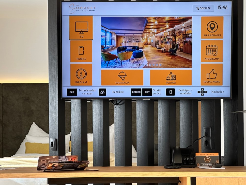 In der Suite habt ihr gleich zwei große Flatscreen. Hier findet ihr neben den TV-Programmen auch alle Infos zum SeeMount Resort, wie Wellnessangebot und Kulinarik, aber auch zum Ort See und zum Paznauntal.