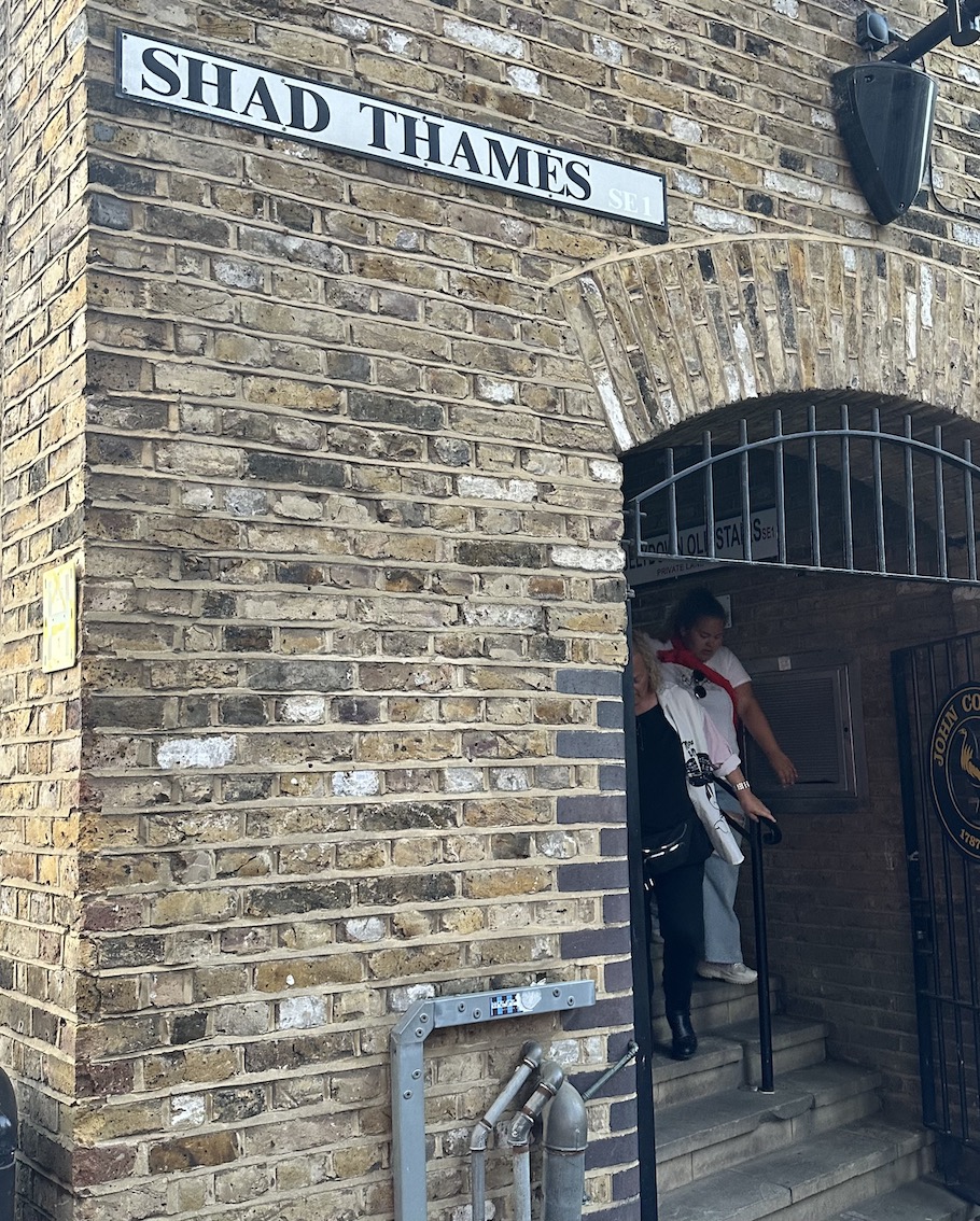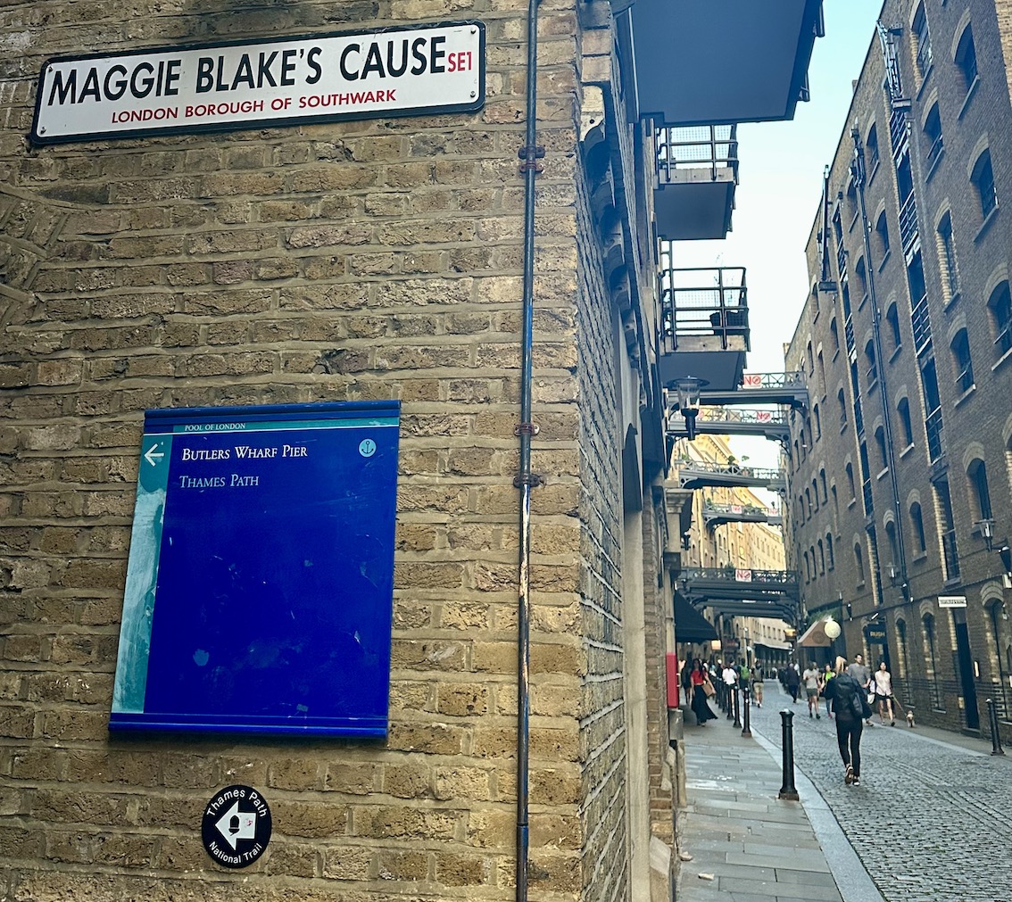 Auf der gegenüberliegenden Seite könnt ihr euch den Instagram-Fotospot von der Maggie Blake`s Cause suchen. Beim Straßenschild SHAD THAMES geht es erst ein paar Stufen rauf, dann wieder runter direkt zur Thames.