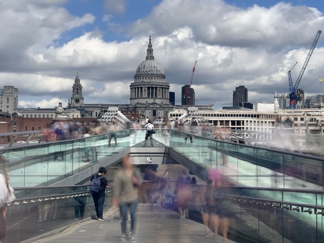 Wir überqueren die fünfte Brücke auf unserer Brücken-Tour, die futuristische Millenium Bridge. Auch bekannt aus den Harry Potter Filmen.