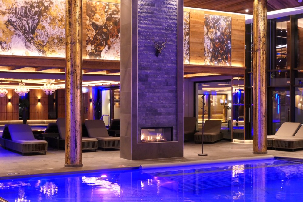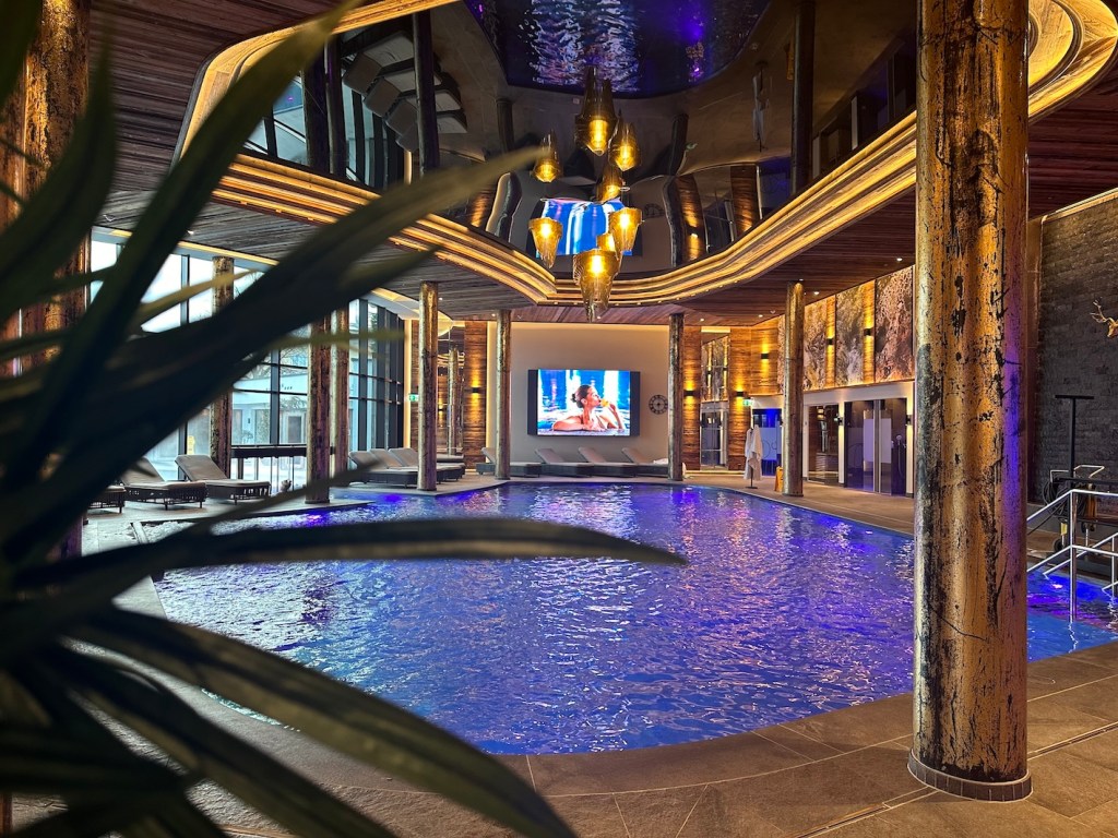 Goldene Säulen, viele Spiegelelemente, indirekte Beleuchtung, wunderschöne Holzstrukturen und Kaminfeuer. Da macht das Relaxen doch gleich noch mehr Spaß.