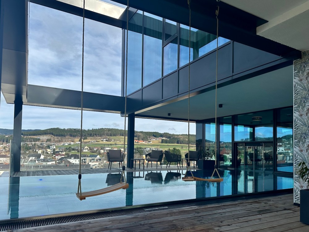 Nachdem die gepackte Wellness-Tasche mit kuscheligem Bademantel schon bereit steht, ab nach oben, zum SKY Pool. Aus Nachhaltigkeitsgründen verzichtet das Freigold auf Badelatschen, also vergiss nicht deine Badeschuhe in den Koffer zu packen.