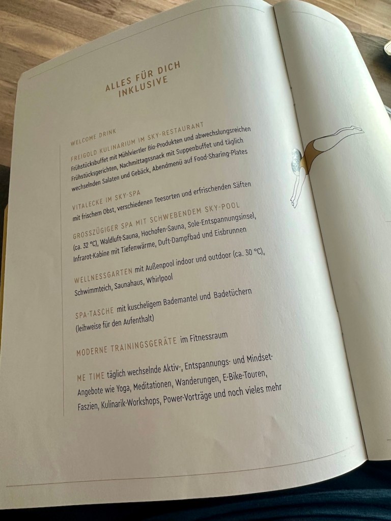 Welcome Drink – Freigold Kulinarium im Sky-Restaurant – Vitalecke im Sky-Spa – großzügiger SPA mit schwebendem Sky-Pool – Wellnessgarten – Fitness-Studio – täglich wechselnde Aktiv-, Entspannungs- und Mindset-Angebote.