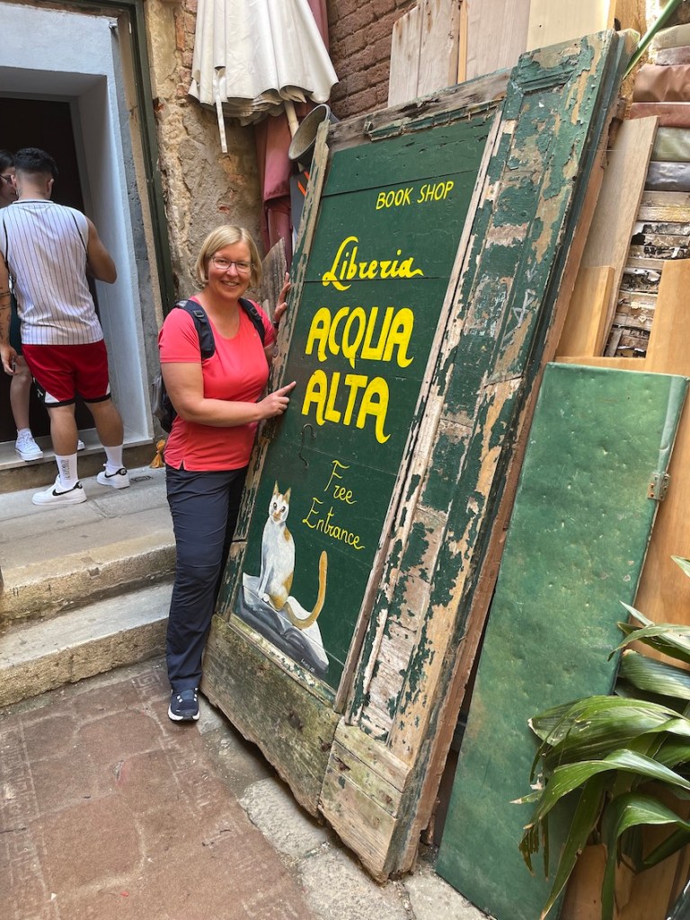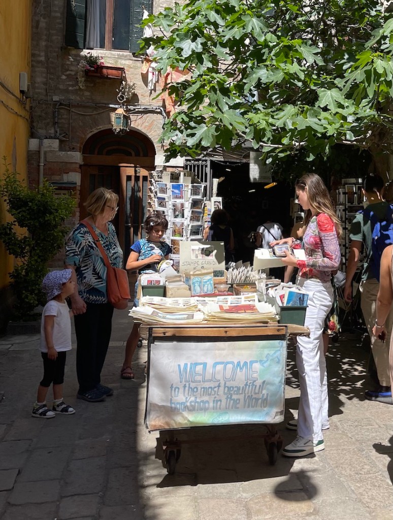 Im Gänsemarsch geht es mit vielen weiteren Besuchern einmal durch den gesamten Laden, vorbei an Gondeln und Regalen voller Bücher, raus in einen kleinen Innenhof. Über eine Treppe aus Büchern geht es nach oben zum Fotospot, noch einmal über die Mauer auf den Kanal schauen und wieder runter.