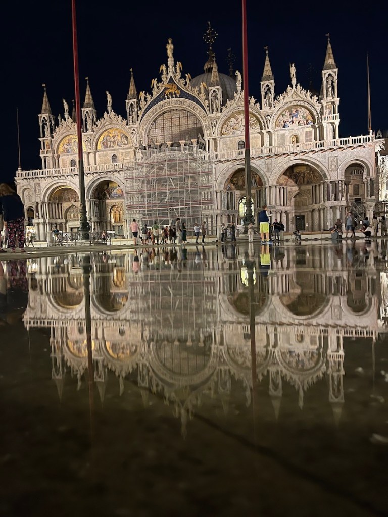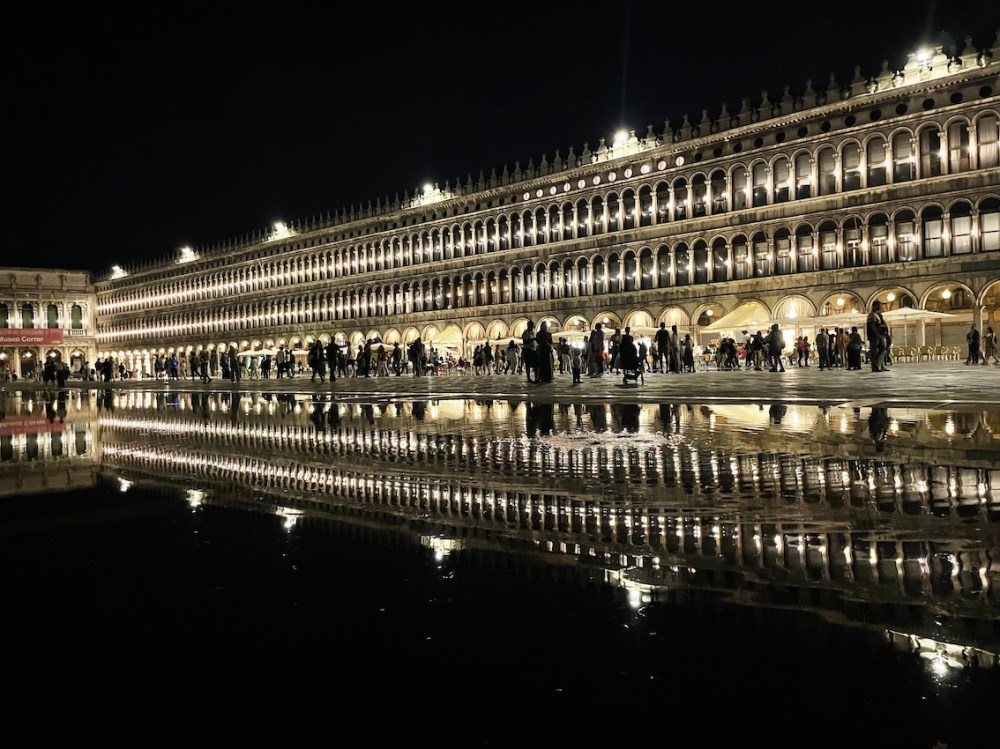 Wir waren abends nochmal auf dem Markusplatz unterwegs, als ganz langsam und gleichmässig das Wasser an einigen Stellen stieg. Der Markusplatz ist der niedrigste Ort in Venedig, daher ist er häufig vom Hochwasser betroffen. Vermutlich beeinflusst durch den Vollmond stieg der Wasserspiegel. Wenn der Wasserspiegel die 100 Zentimeter-Marke übersteigt gibt es „Acqua alta“ – Hochwasser. In der Regel sind es aber nur wenige Zentimeter.