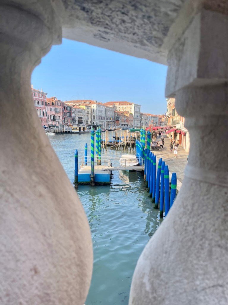 Mein Lieblings-Fotospot ist jedoch gegenüber vom großen Luxus-Kaufhaus auf der anderen Kanalseite. Einfach um den Palazzo dei Camerlenghi rum, dann hast du die typischen, rot-weiss gestreiften, venezianischen Holzpfosten mit auf dem Bild.