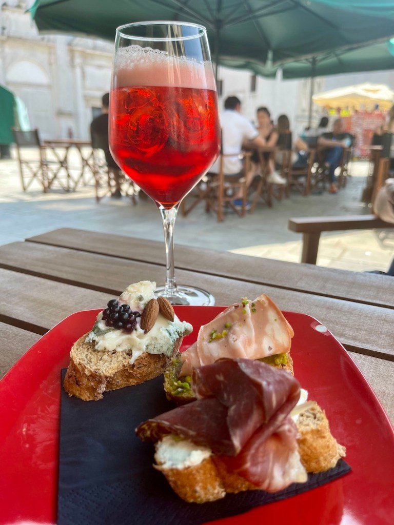 Gönnt euch entweder den zugegeben etwas teueren Genuss an einem der Tische mit Livemusik direkt auf dem Markusplatz und nehmt den Musikbeitrag von 6 Euro pro Person in Kauf.