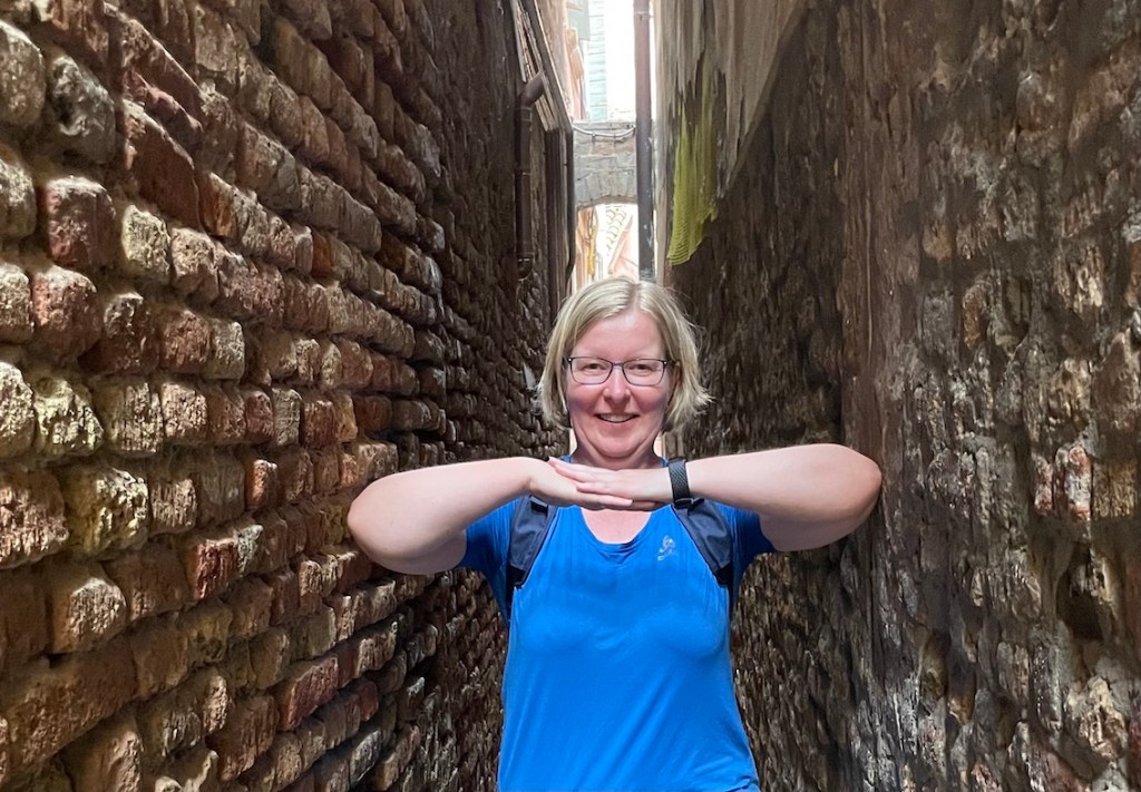 Trotz Navigation mussten wir etwas rumsuchen, um diese engste Stelle der Gasse zu finden. Die Calle Varisco im Stadtteil Cannaregio ist lediglich 52 Zentimeter breit. Sie zählt damit zu den drei schmalsten Straßen Europas.