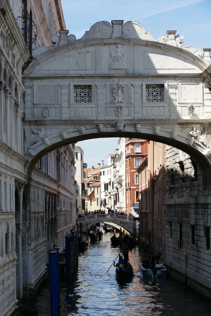 Bevor es in den Dogenpalast hinein geht, haben wir uns die berühmte Seufzerbrücke von außen angeschaut. Die geschlossene und überdachte Brücke verbindet den Dogenpalast mit dem Gefängnis nebenan. Sie führt über den Rio di Palazzo, einen etwa acht Meter breiten Kanal.