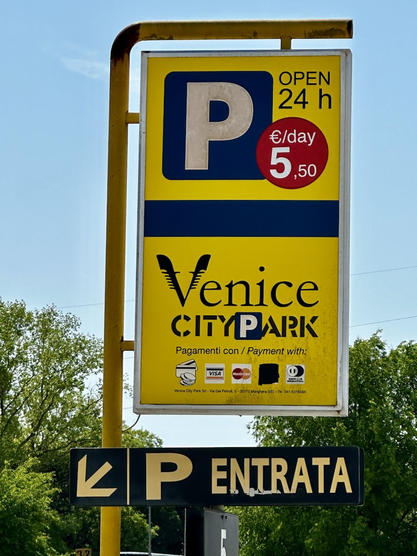 Die Parkplätze auf dem Festland rund um Mestre – Marghera sind echt ideal. Um unseren Parkplatz rum gibt es noch 2-3 weitere Parkplätze mit ähnlichen Preisen. Die Ausfahrt ist die letzte vor der Ponte Liberta, der langen Brücke nach Venedig.