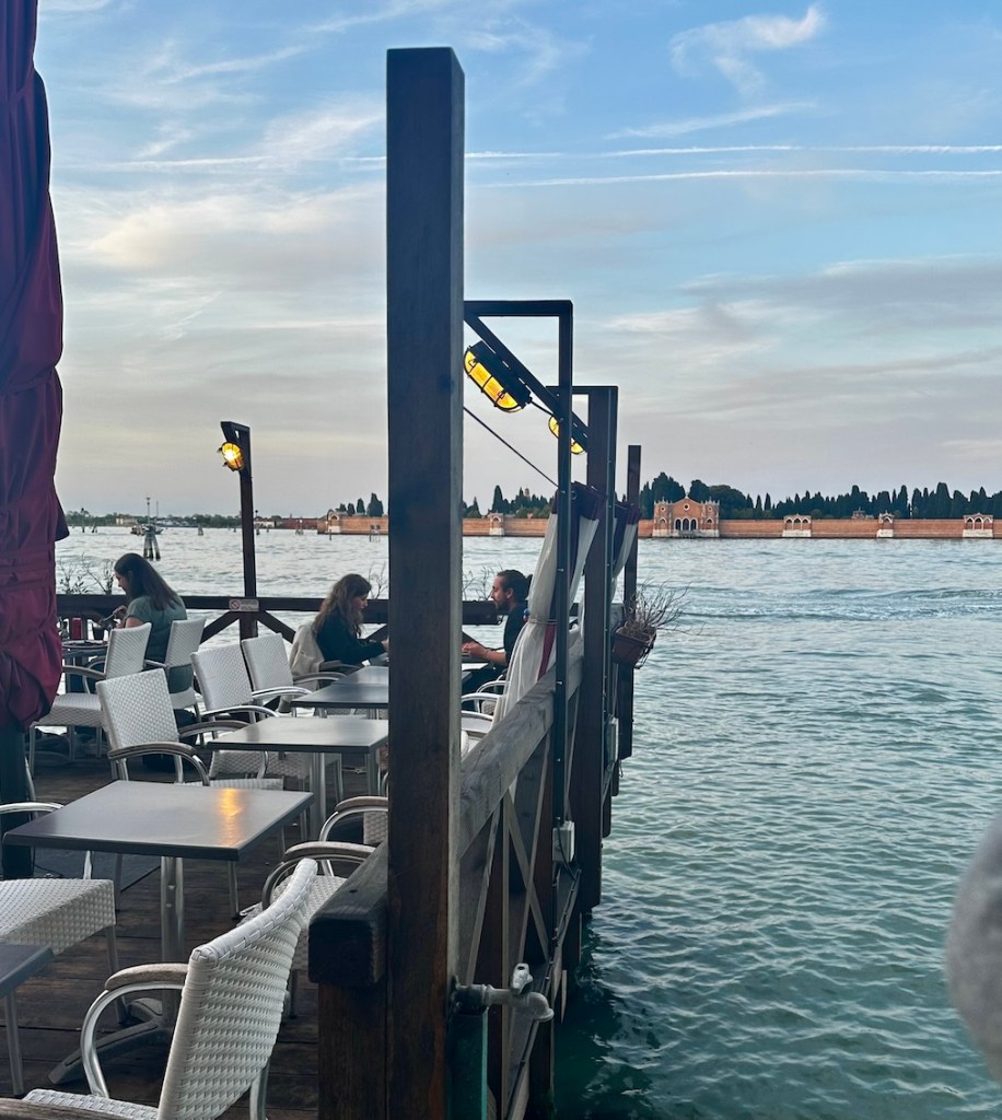 Eine Terrasse auf dem Wasser mit Blick auf die Friedhofsinsel und dazu köstliche Fischgerichte, Pasta und Pizza – das kann nur das Da Alvise sein.