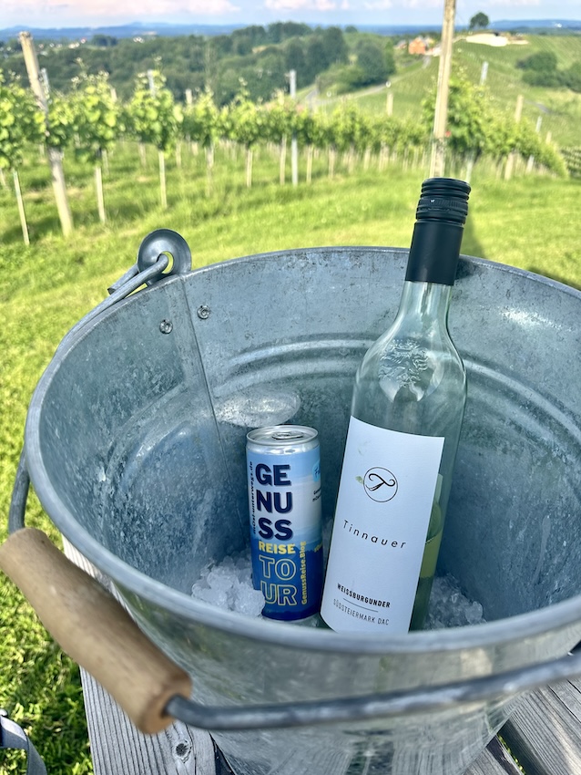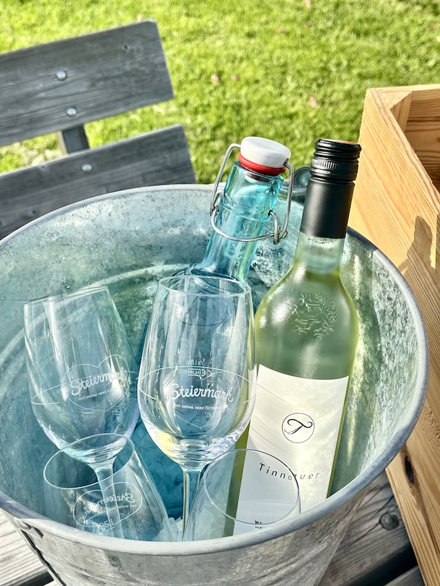 Dann suchst du dir noch die passende Flasche Wein aus und eine Flasche Wasser oder Saft dazu. Für die Getränke bekommst du einen mit Eiswürfel gefüllten Metalleimer und passende Steiermark-Gläser dazu.