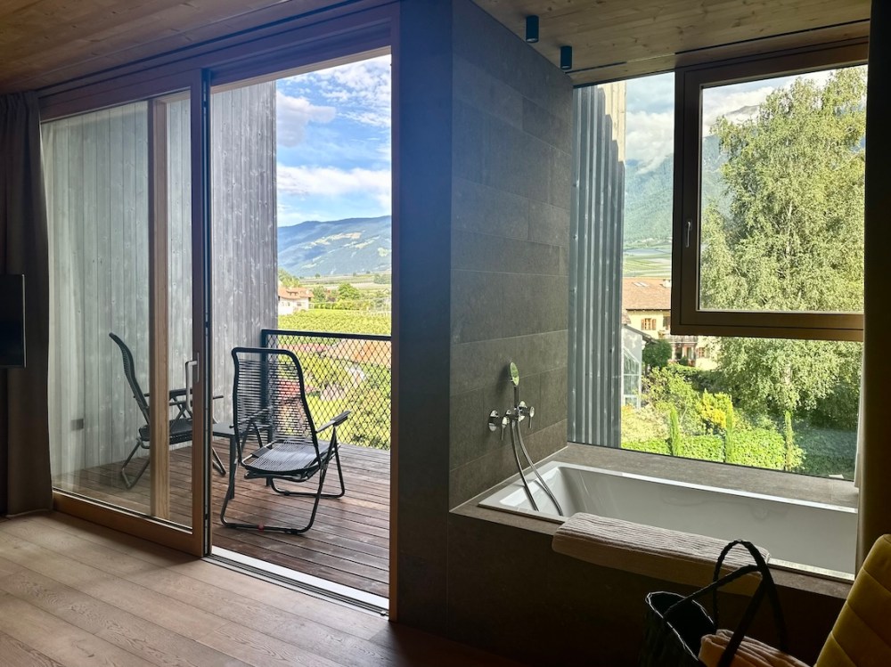Ein Highlight ist auch die Badewanne, die hier an der Fassade mit Panoramablick über die Garten- und Poollandschaft integriert ist. Das haben wir so noch in keinem anderen Hotel gesehen.