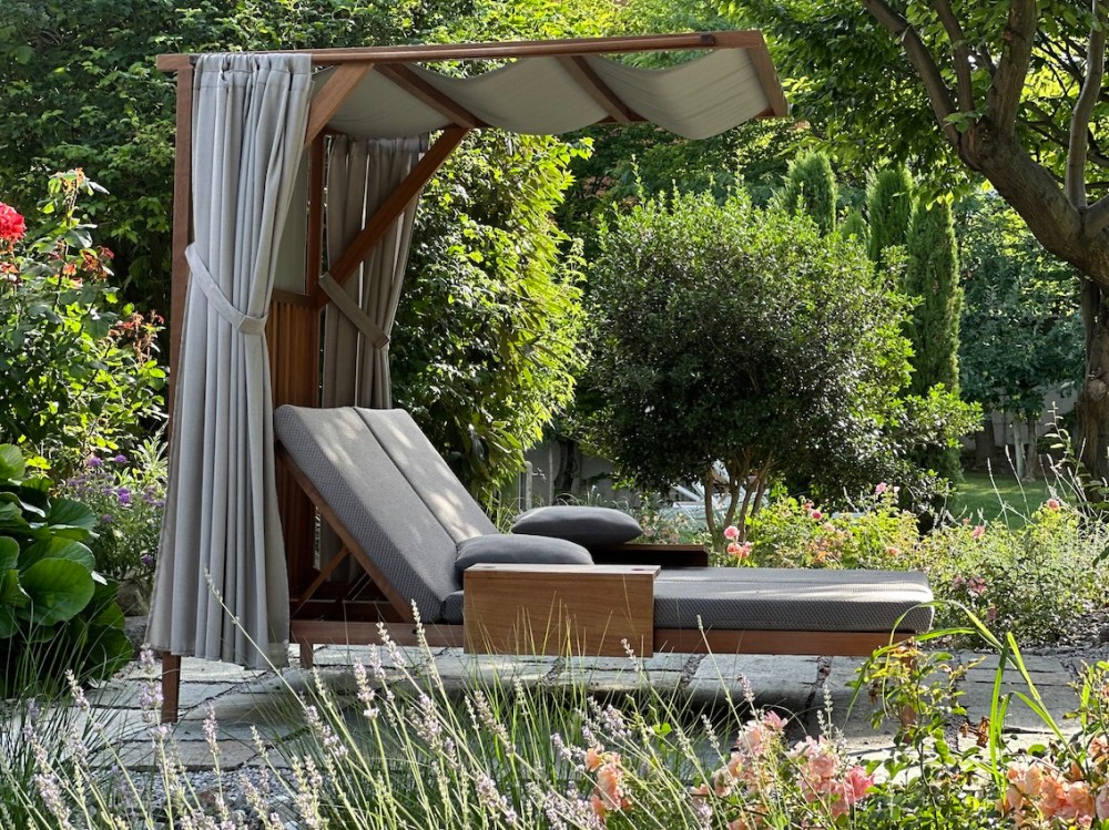 Ideal für einen Aperitif vor dem Abendessen ist die chillige überdachte Lounge.