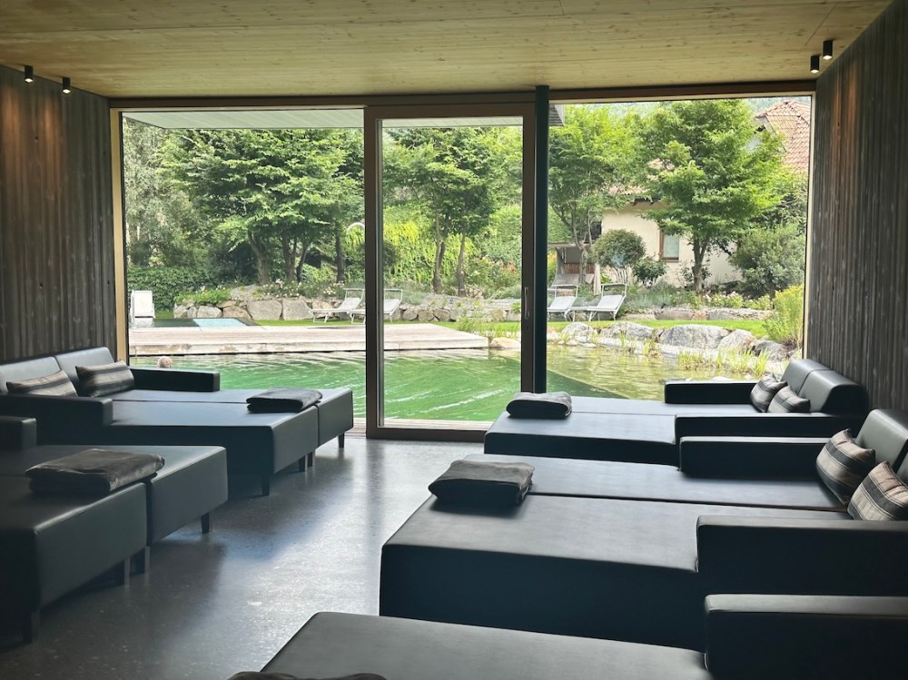 Bei Schlechtwetter ist genügend Platz in den drei stylischen Ruheräumen mit Panoramablick auf die Poollandschaft und die umliegenden Berge.