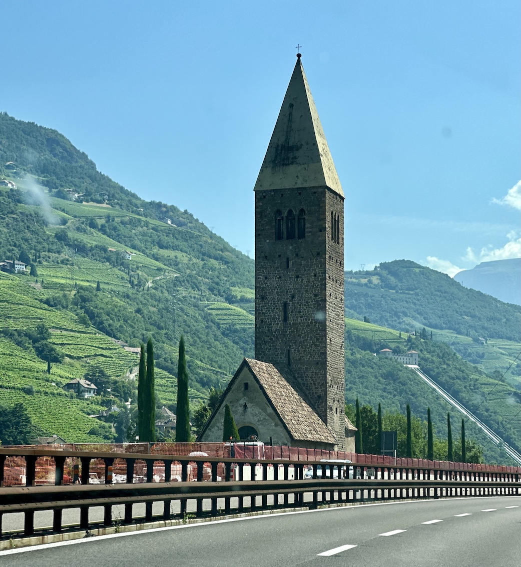 Der Kirchturm bei Bozen ist für uns das Tor Südtirols. Von der Autobahnausfahrt Bozen Süd geht es weiter Richtung Meran, in die Ferienregion Vinschgau.