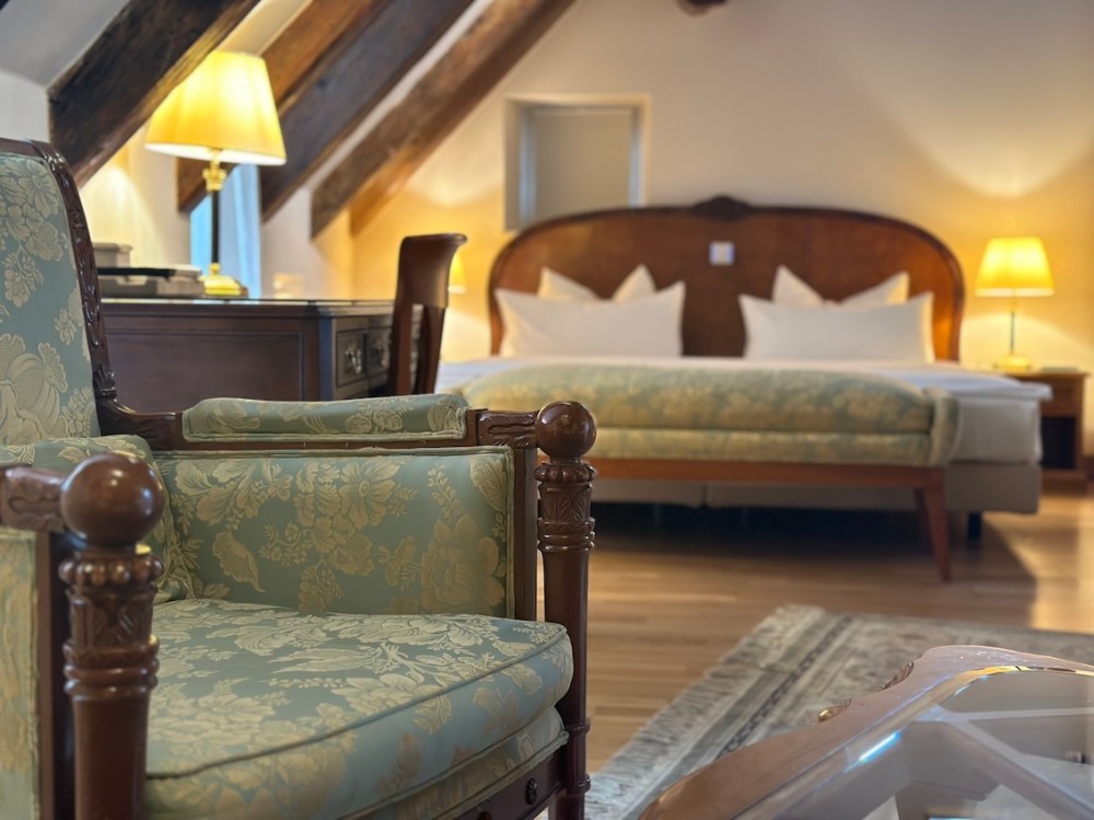 Wir werden super herzlich empfangen und können gleich einchecken – unser Zimmer ist schon fertig. Ohne Aufzug geht es drei Stockwerke über eine urig knarzende Holztreppe ganz nach oben ins schönste Zimmer des Hauses.