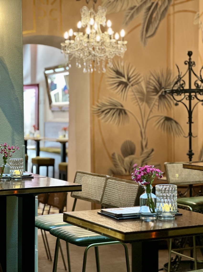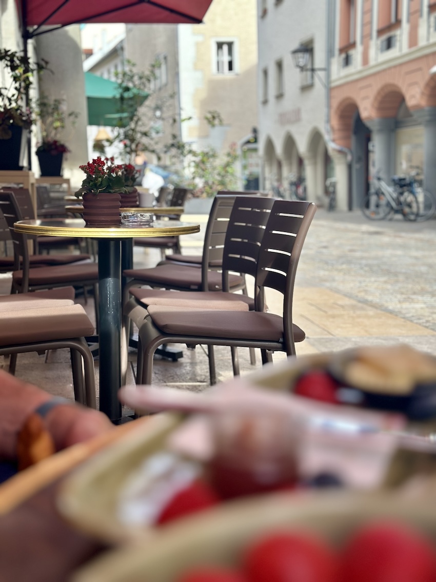 Wunderbar angerichtete Bowls mit frischen Früchten, frisch gepresster Orangensaft und Kaffee von der bayerischen Kaffeerösterei DINZLER, der perfekte Start in den Tag. Dazu das quirlige Treiben auf der Straße beobachten. Wir fühlen uns pudelwohl.