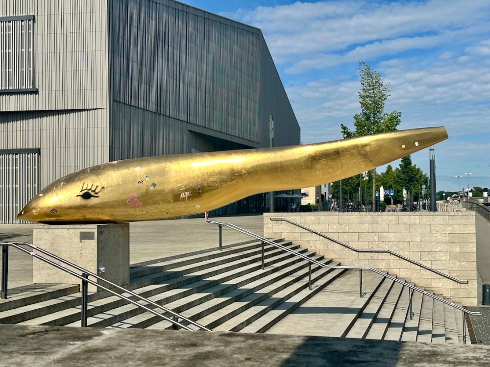Direkt vor dem Haus der Bayerischen Geschichte steht das Kunstwerk. Der Waller ist das Siegermodell eines deutschlandweiten Kunstwettbewerbs, der 2014 im Rahmen der Neugestaltung des Donaumarkts von der Stadt Regensburg durchgeführt worden war.