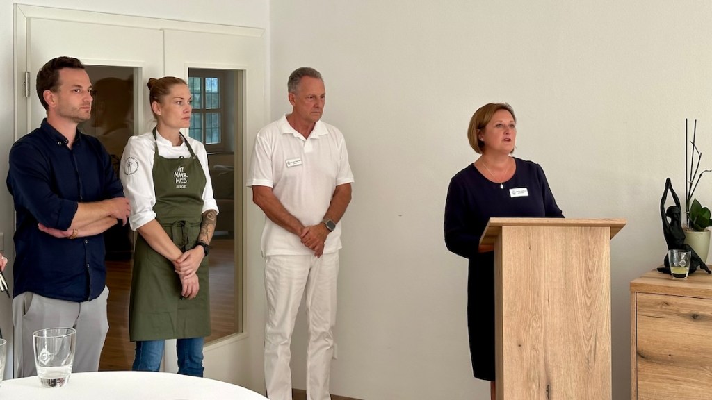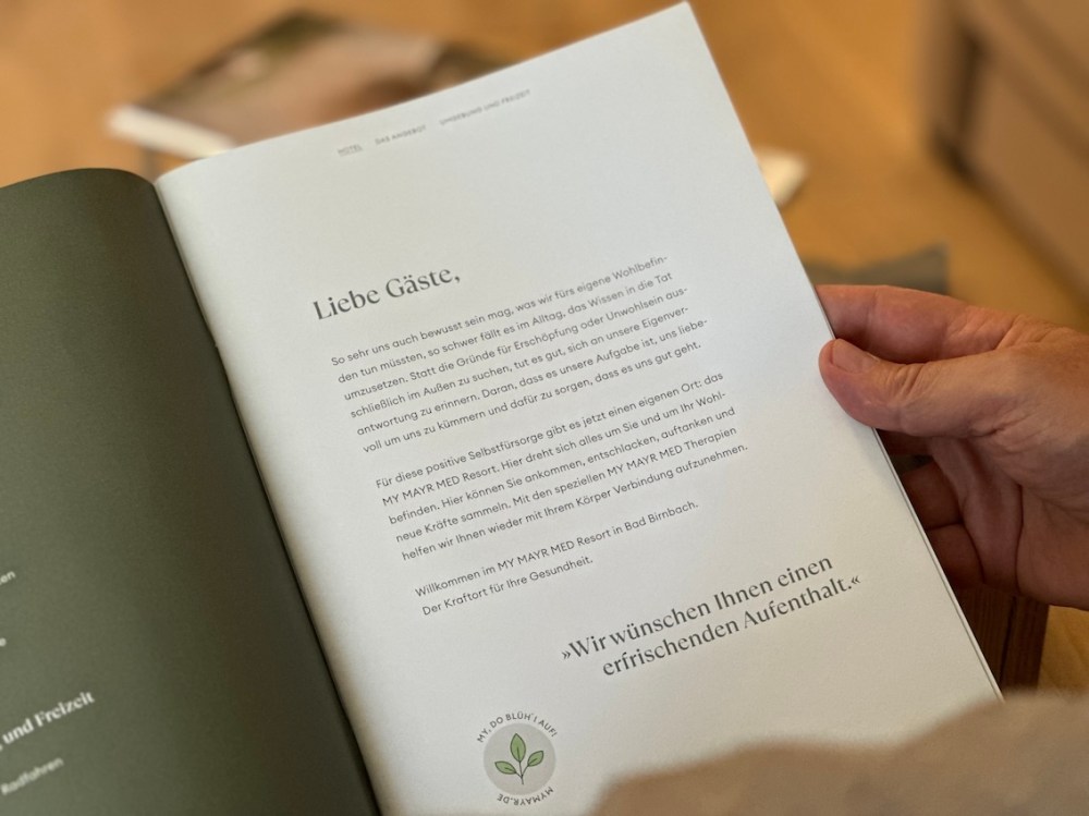 Bei der Begrüßung und Team-Vorstellung durch Hotelmanagerin Bianka Hallhuber erfahren wir, dass Resort-Inhaber und Multi-Unternehmer Hannes Weber vom Traditionsunternehmen Wasner sich nach einem Hörsturz sehr intensiv mit dem Thema Gesundheit auseinander gesetzt hat und die positive Wirkung der F.X. Mayr-Methode selbst erlebt hat.
