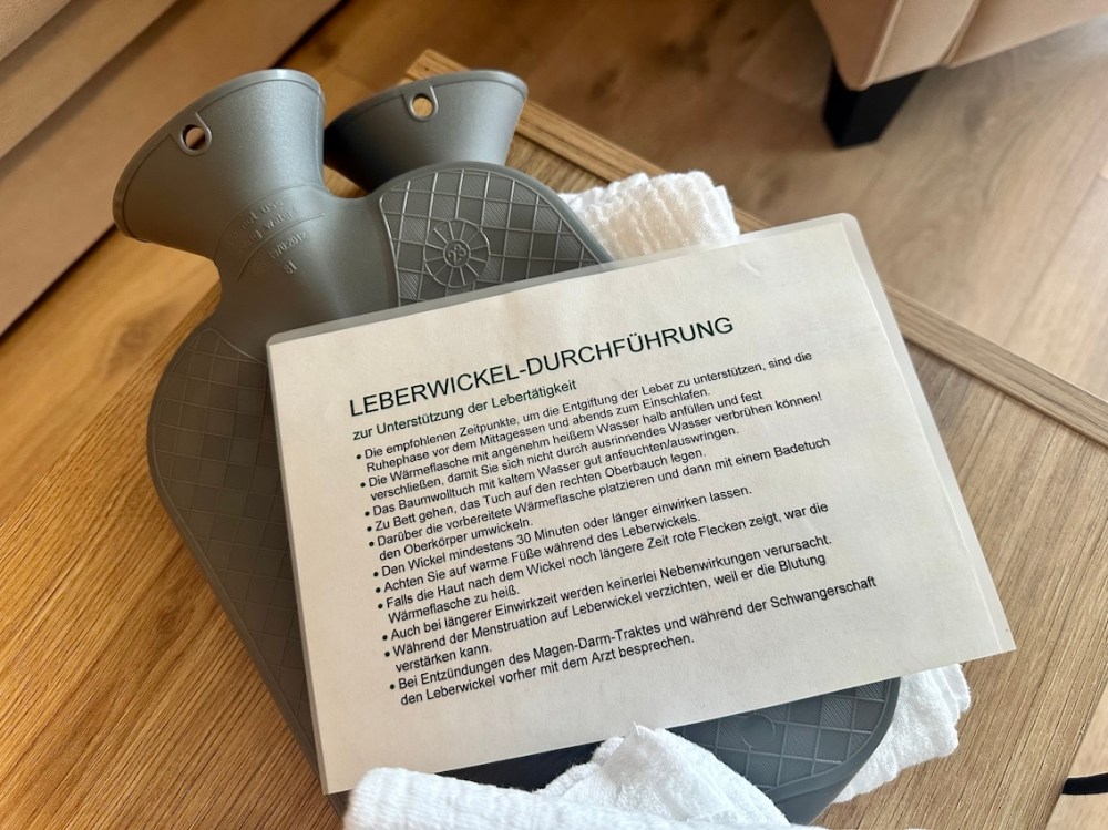 Und zu unserer Überraschung mit einer Anleitung und allen Utensilien für einen Leberwickel zur Unterstützung der Lebertätigkeit. Ja, das ist diesmal wirklich eine ganz andere Art von Auszeit.