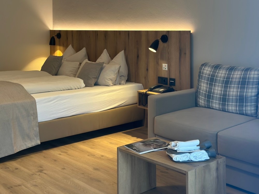 Die Juniorsuite ist sehr geräumig, mit Balkon zur Nordseite und Blick ins Grüne.