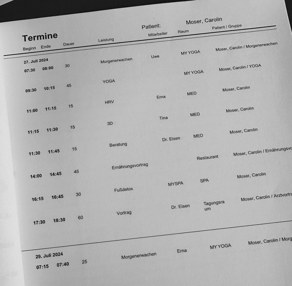 Unsere Tage sind durchgeplant. Jeder bekommt seine bereits gebuchten MY-Termine in einer Übersichtsmappe überreicht.