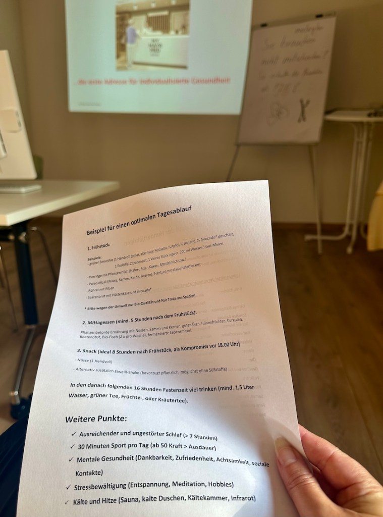 „Länger leben, später altern!“ Durch individuell abgestimmte Maßnahmen wird dir geholfen den Alterungsprozess merklich zu verlangsamen und deine Lebenskraft anhaltend zu steigern. Nach dem Arztvortrag haben wir alle ein signiertes Buchexemplar und diese „One-Million-Dollar-Anleitung“ mit dem optimalen Tagesablauf erhalten.