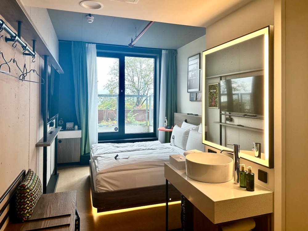 Viele nette Kleinigkeiten, wie jede Menge Steckdosen und kabellose Handy-Ladestation am Bett, kostenloses WLAN, Klimaanlage, Zimmersafe und ein großer Flachbildschirm gehören zur weiteren Ausstattung. Ebenso eine Kapselmaschine mit Kaffee- und Teeauswahl von Nordica Coffee Hamburg und ein kleiner Kühlschrank. Das Lichtdesign steuert du selbst über eine Fernbedienung. Die Beleuchtung unter dem Bett wird auf jeder Seite seperat durch einen Bewegungsmelder aktiviert.