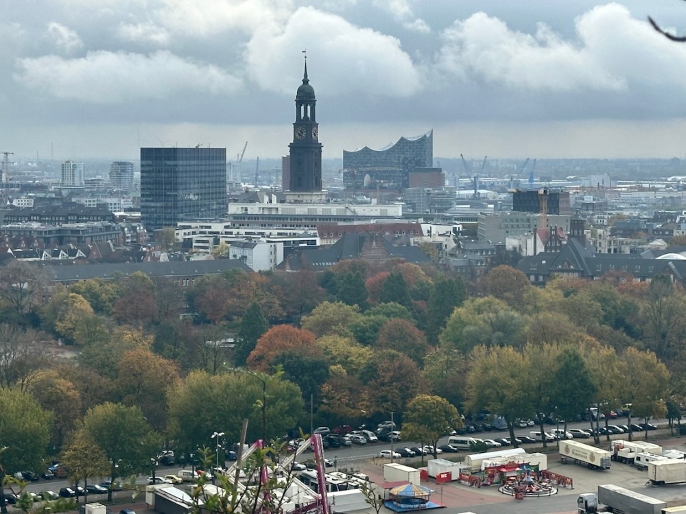 Neben den Tanzenden Türmen, dem Millerntor-Stadion und dem Fernsehturm sind auch der Michel, die Elbphilharmonie und die Hafenkräne zu sehen.