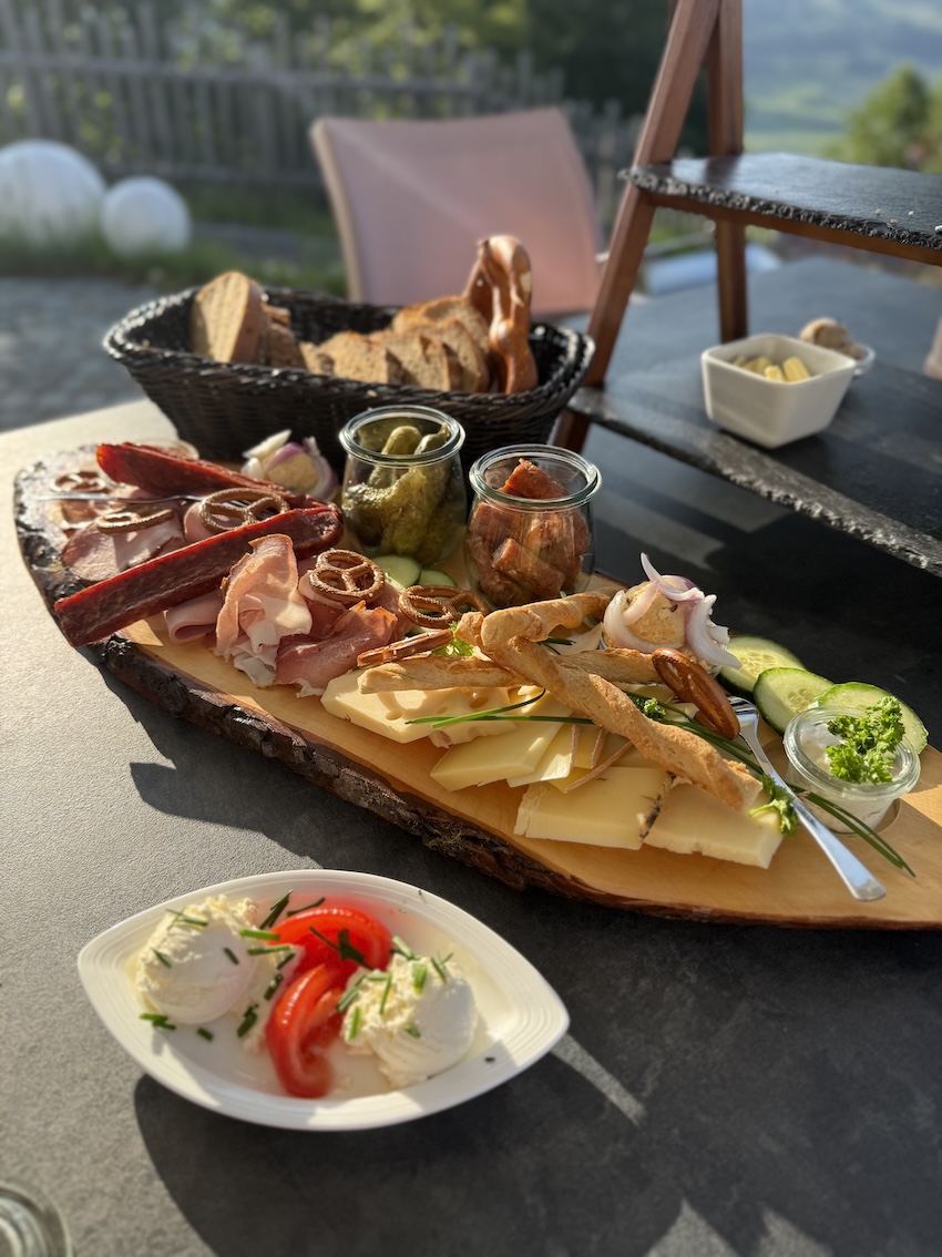 Gleich bei der Buchung kannst du dir für den Anreisetag eine sehr reichhaltige Brotzeitplatte, mit allem was das Allgäu an Genüssen zu bieten hat, vorbestellen. Das würden wir dir auch empfehlen. So musst du abends den kurvigen Alpweg nicht mehr runter ins Dorf fahren.