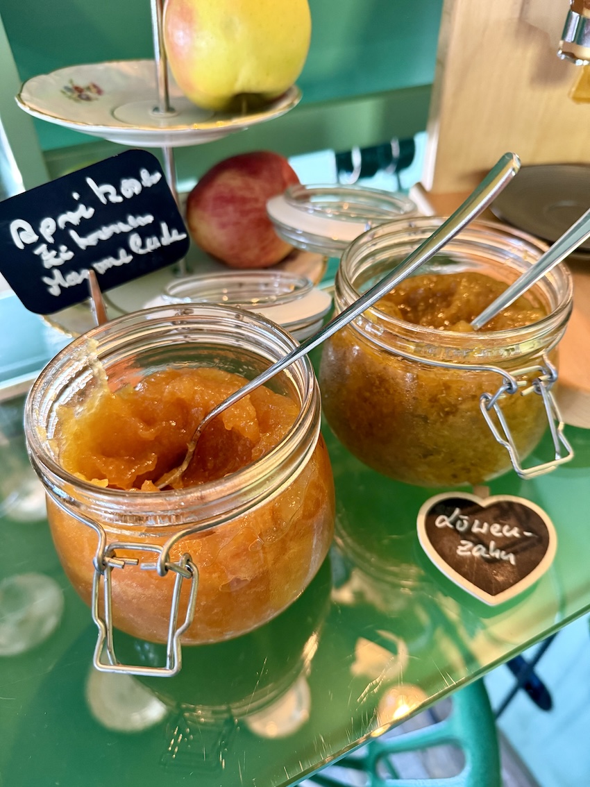 Hier gibt es kein 0815 – alles ist mit viel Liebe ausgewählt um dir einen besonderen Genuss zu bereiten. Hast du schon mal Löwenzahn-Marmelade probiert oder Aprikosen-Zitronen-Marmelade? Auch bei den Aufstrichen, neben Frischkäse gibt es Liebstöckel mit Pinienkernen oder Tomate mit Schafskäse.